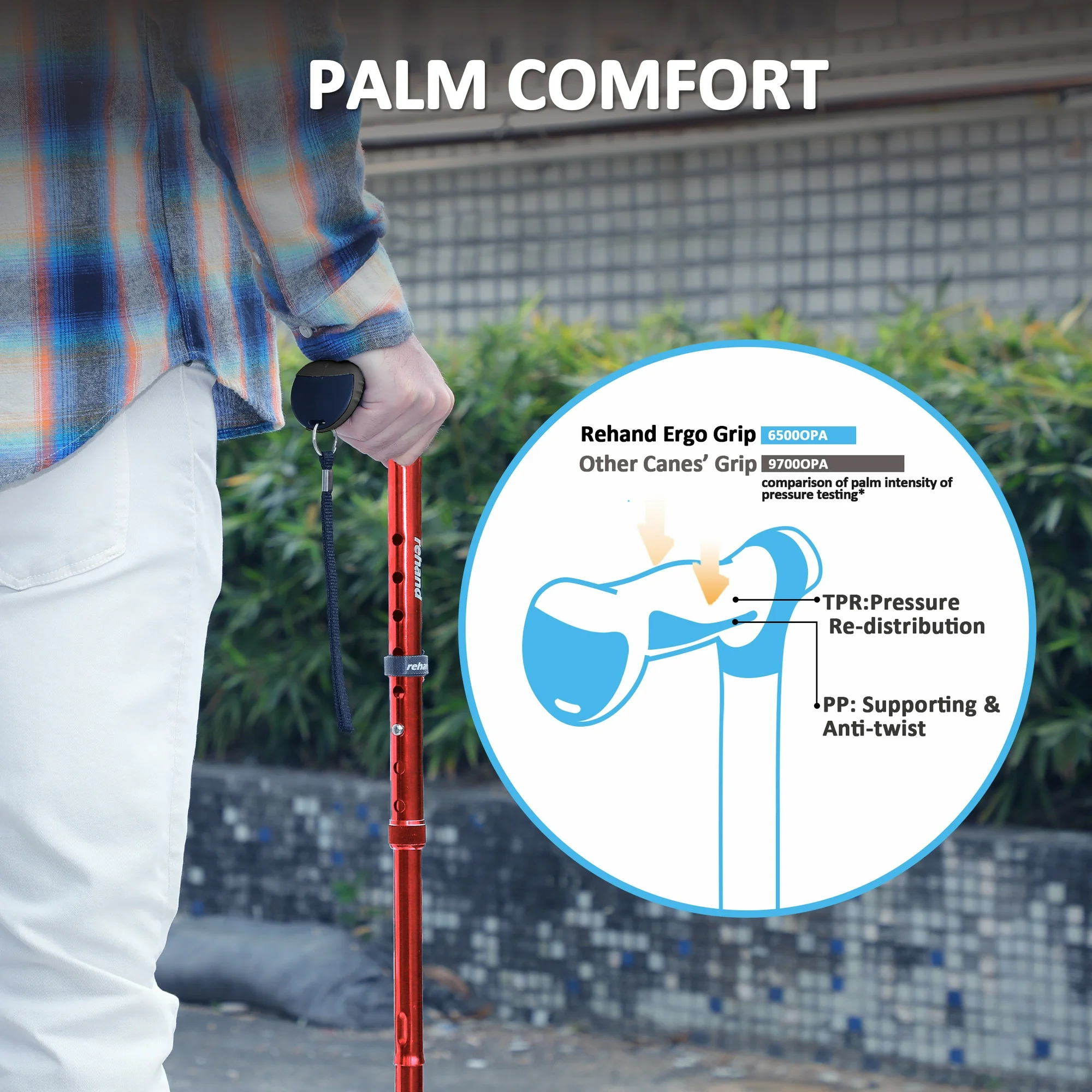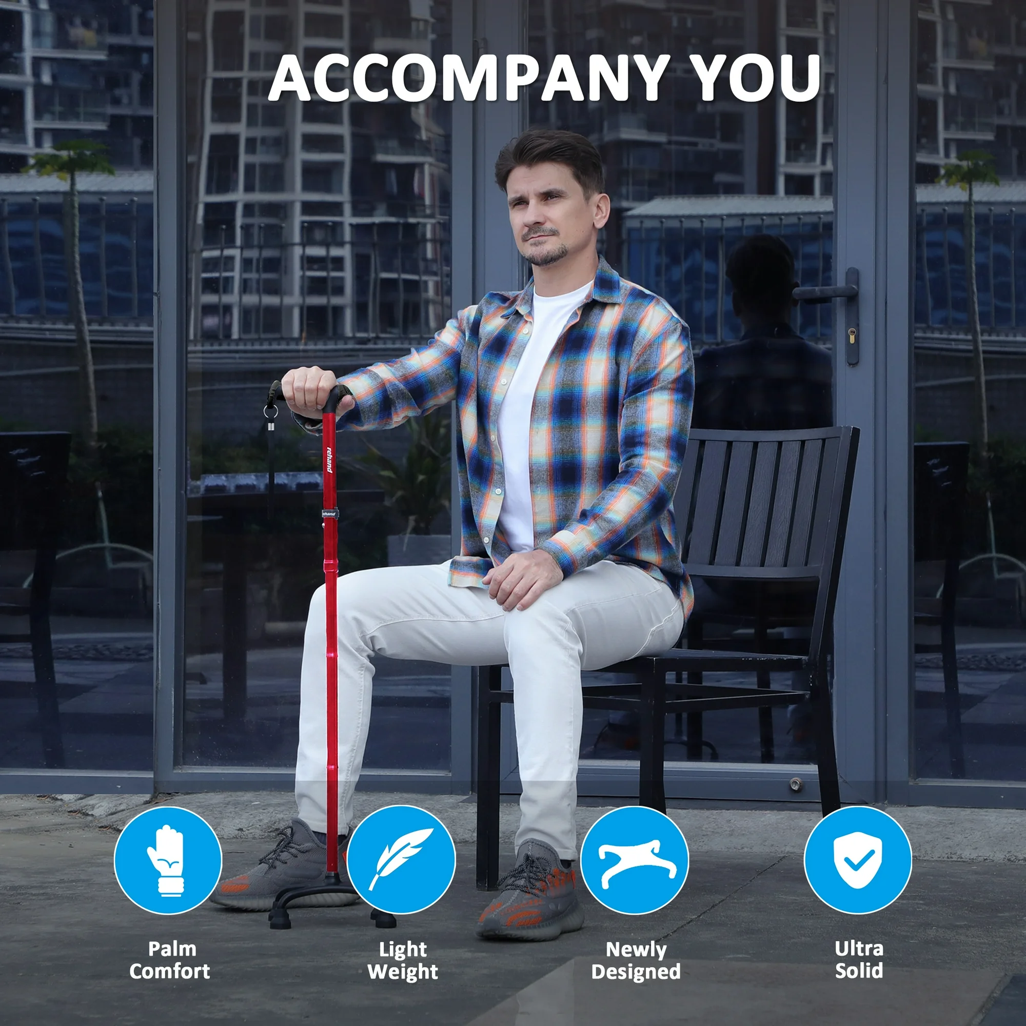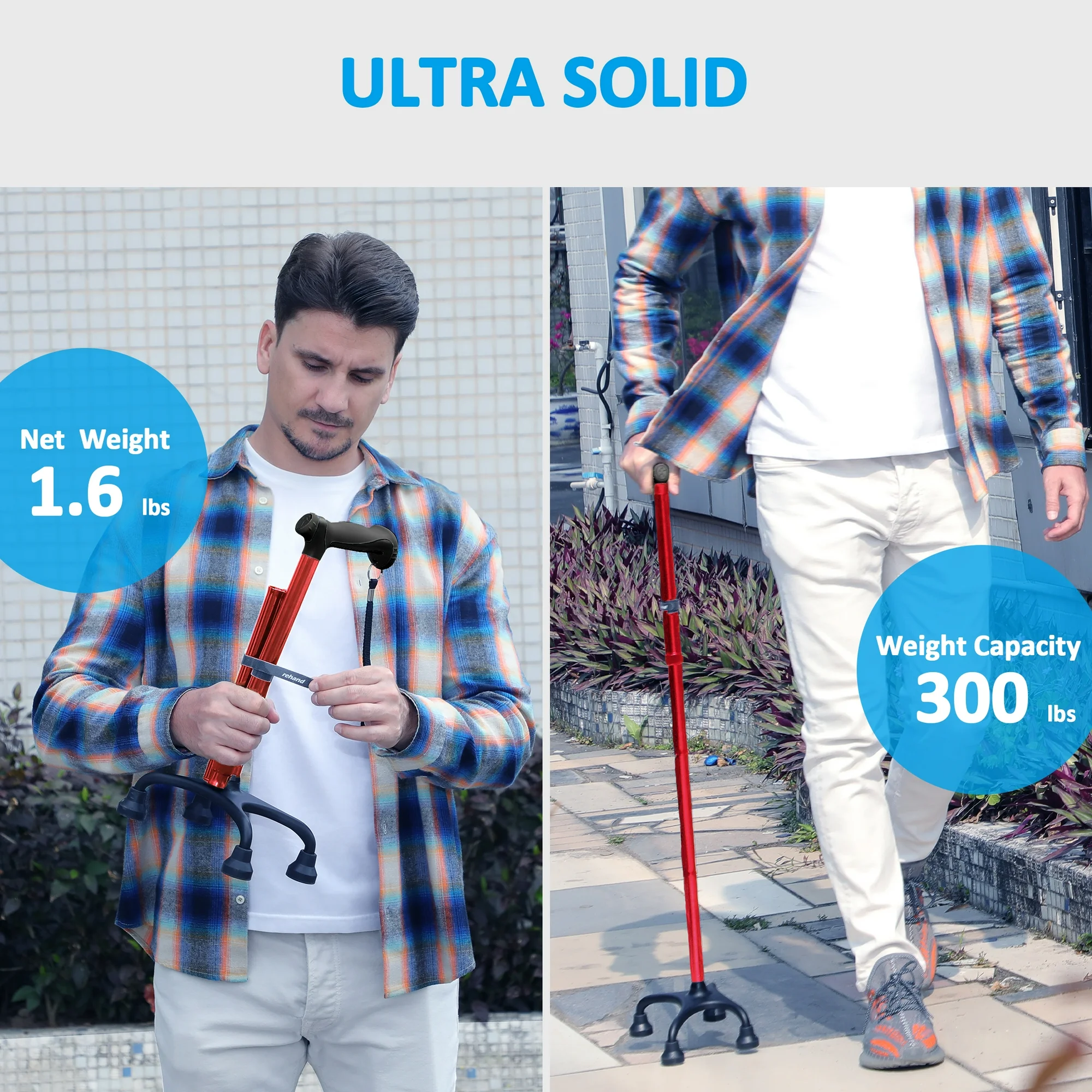 REHAND Adjustable Foldable Quad Cane,Lightweight Walking Cane for Men & Women with 4-Pronged Base for Extra Balance & Stability,Red
