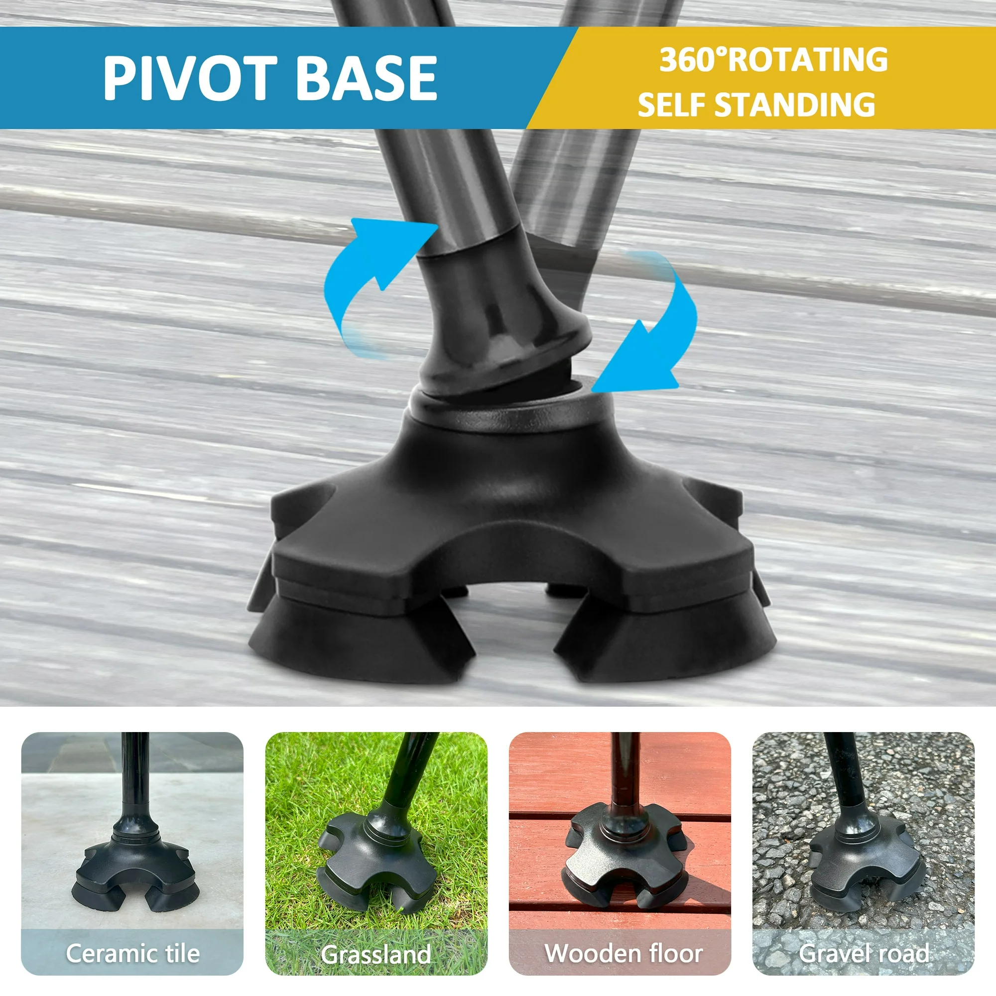 - The Four pronged rotating base with non-slip rubber foot pads offers exceptional stability,Maximum ground contact on the non-scratch rubber base.. The pivoting tip provides excellent traction on all surfaces and make the cane reliable on any terrains.