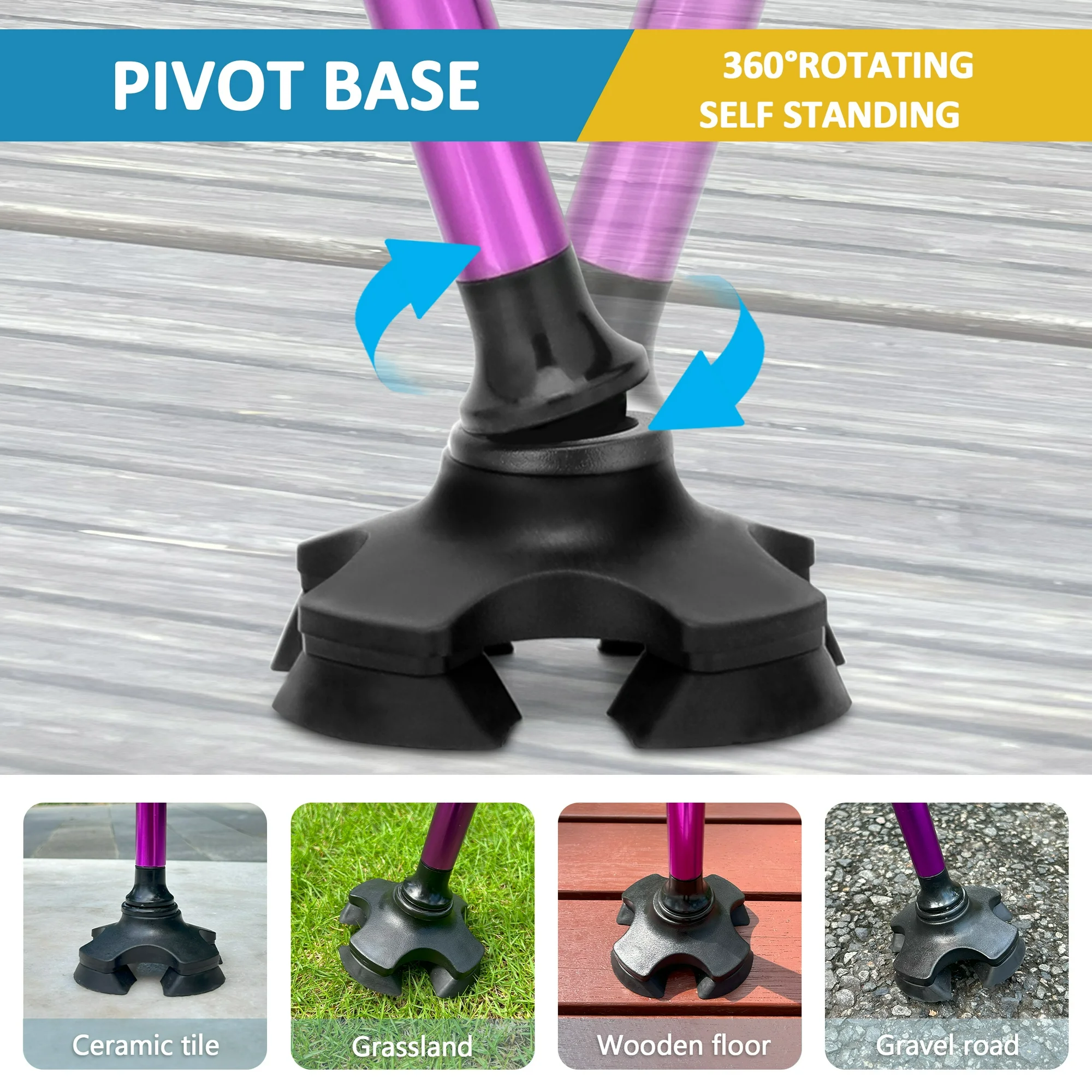 - 【Pivoting Tip】 The Four pronged rotating base with non-slip rubber foot pads offers exceptional stability,Maximum ground contact on the non-scratch rubber base.. The pivoting tip provides excellent traction on all surfaces and make the cane reliable on any terrains.