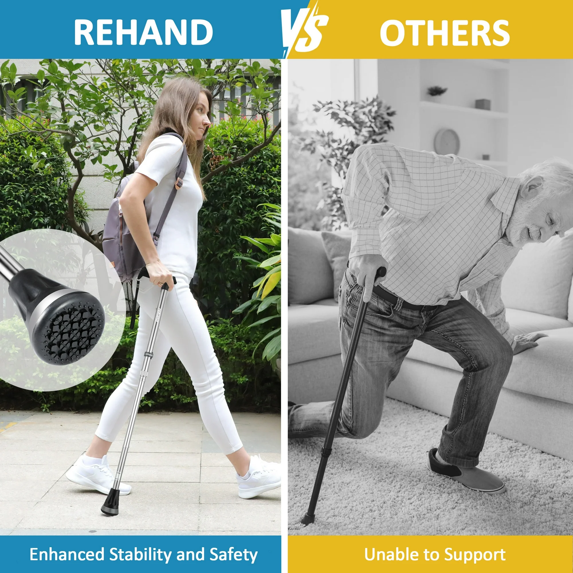 - Self-Standing: Rehand all terrain pivot quad cane uses a self-standing design, which allows you to easily rest it upright and no longer lean it against the wall whenever you need a break.