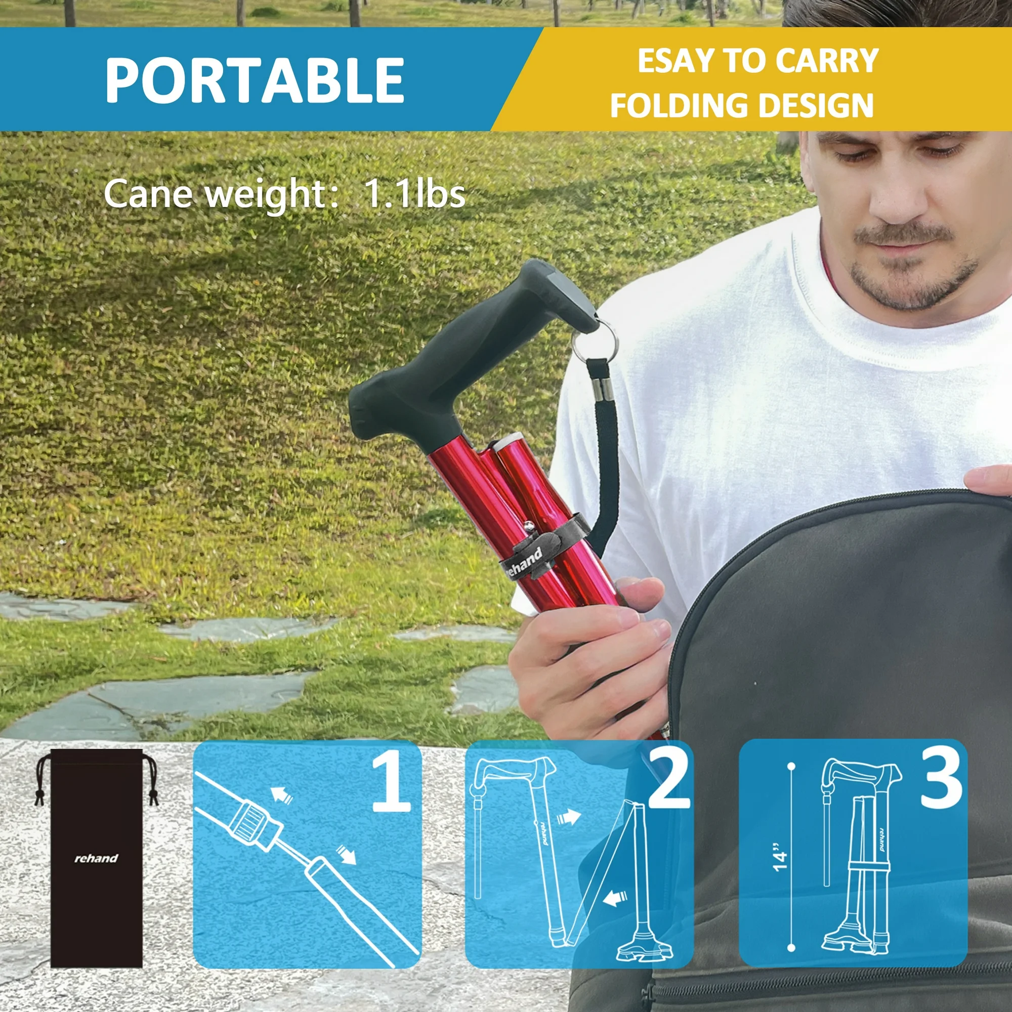 REHAND Self Standing Pivot Walking Cane for Men & Women – Foldable,Adjustable,Lightweight,Soft Handle Grip with Travel Bag, Walking Sticks for Seniors & Adults,Red