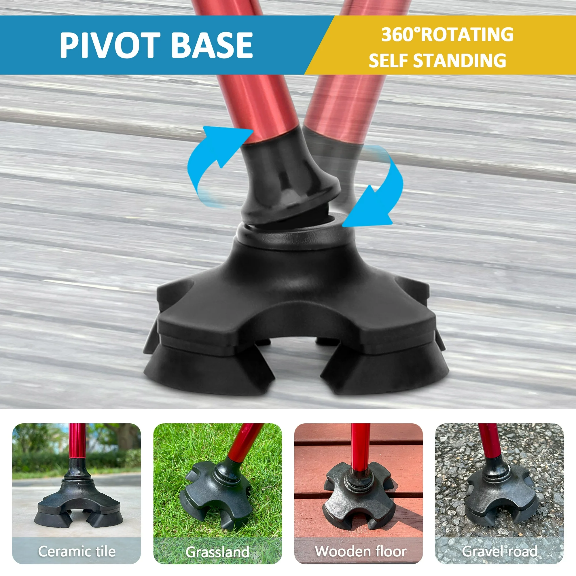 - Pivoting Tip: The 4-pronged rotating base with non-slip rubber foot pads offers exceptional stability. The pivoting tip provides excellent traction on all surfaces and make the cane reliable on any terrains.