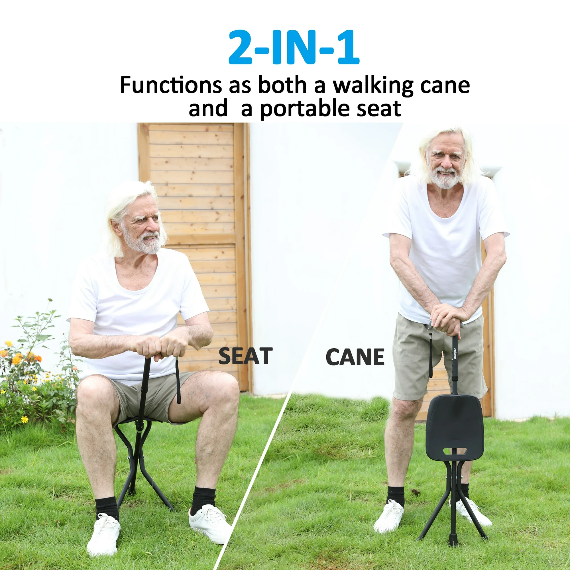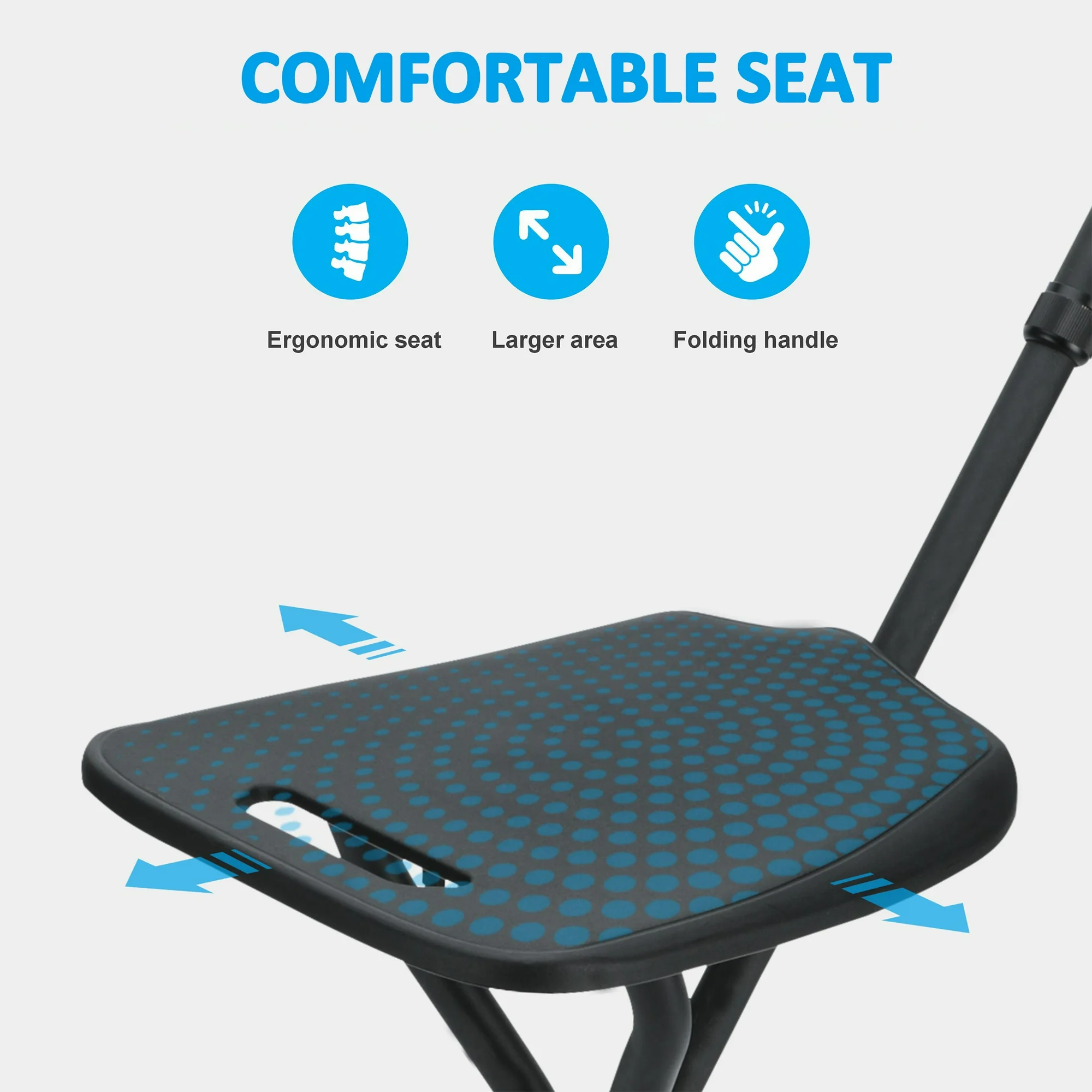 【EXTRA LARGE SEAT AND STURDY SUPPORT】 This walking cane with seat is designed for providing extra support with extra large seat of 10.4” length and 9.3” width.Dual stability and Reinforced Structure, with EN 581 standard tested by SGS.Suitable for using as a camping chair with the function of a walking stick at the same time.