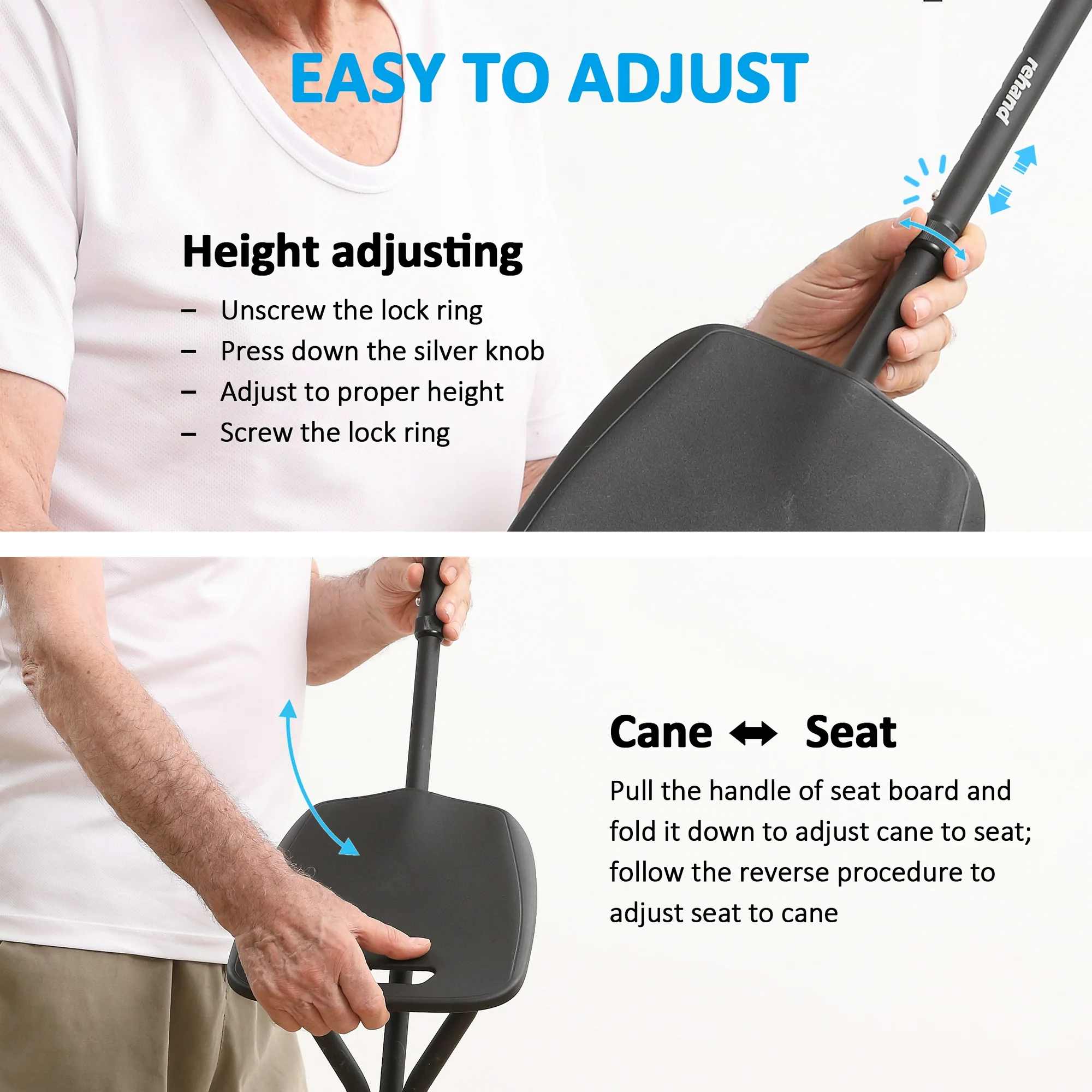 【UP TO 5 ADJUSTABLE HEIGHT】 Rehand adjustable cane chair fits for people from 5’5”(168cm) to 6’5”(195cm). 5 adjustable height with one-inch increments makes almost all seniors, elderly and injured persons can easily adjust the cane to proper height fitting user’s height. The adjusting range is from 34 inches(86cm) to 38 inches(96cm).